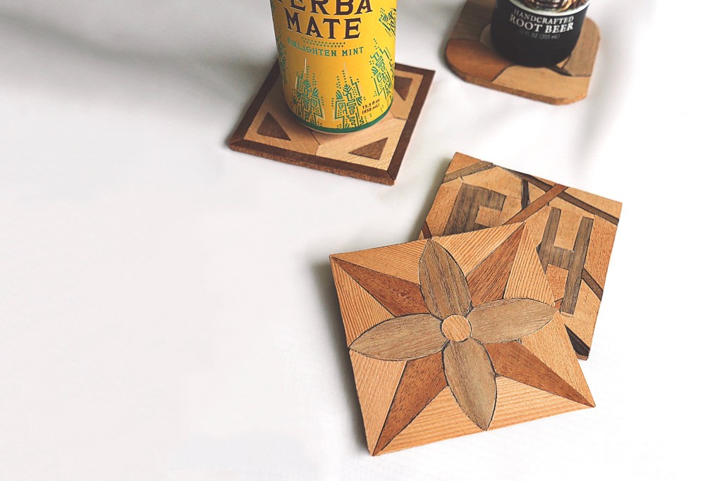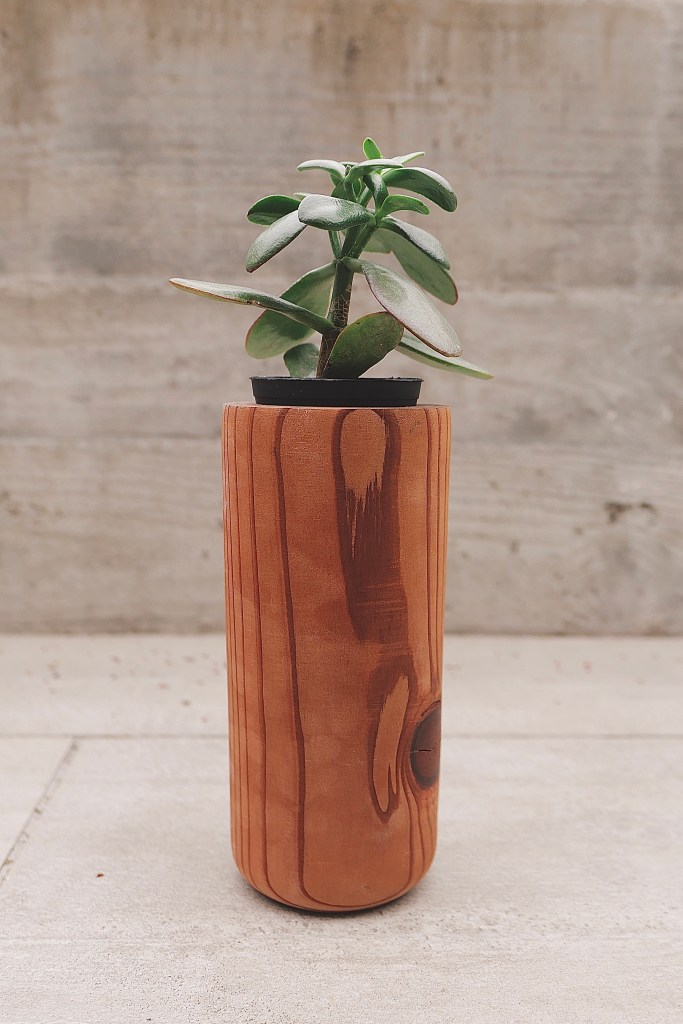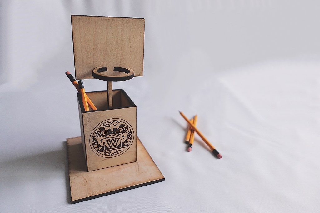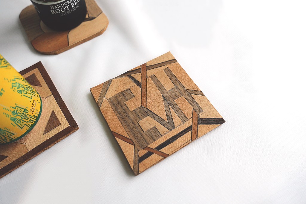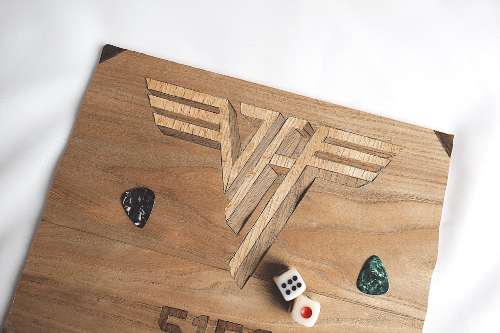 A sports themed pencil holder.A hand-crafted cutting board made out of walnut and cherry oak. A gift for my Mom & Dad.A set of 4×4 coasters made out of various veneers and glued on top of a square of cork.A veneer inlay representing Van Halen’s 5150 album.A flower pot made out of cherry oak and crafted on a lathe. Another gift for my Mom & Dad.A walnut keychain crafted on a lathe.