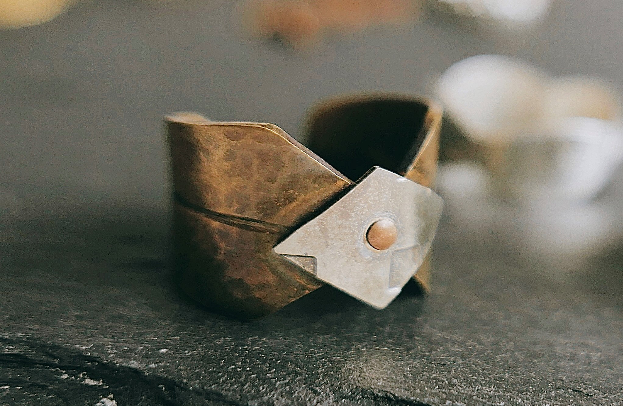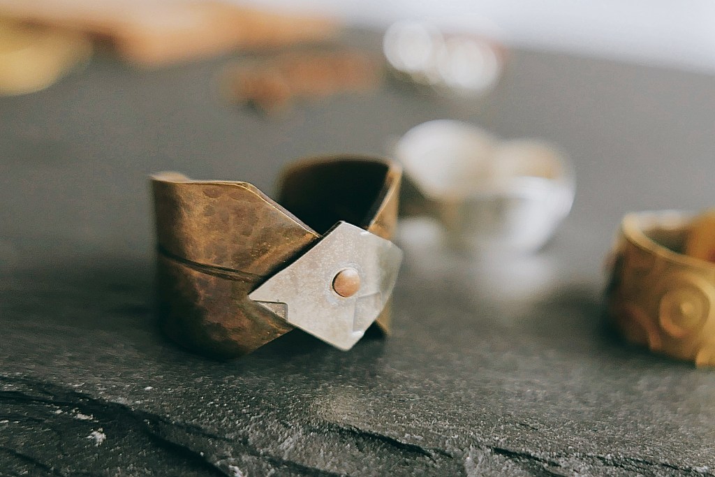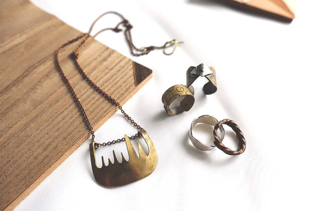 Metal jacetheluthierSeptember 29, 2021October 25, 2021Uncategorized Post navigation PreviousNext A collection of handmade jewelry A set of rings made using riveting and soldering techniques along with a pendant that has a hand-made clasp. All jewelry is either made with brass, copper or silver. Share this: Share on X (Opens in new window) X Share on Facebook (Opens in new window) Facebook Like Loading... Related